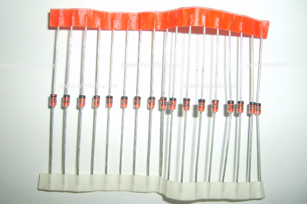有的穩壓二極管上僅有2道色環,而有的卻有3道。最靠近負極的為第1環,后面依次為第2環和第3環。僅有2道色環的。標稱穩定電壓為兩位數,即“×× V”(幾十幾伏)。第1環表示電壓十位上的數值,第2環表示個位上的數值。如:第1、2環顏色依次為紅、黃,則為24V。