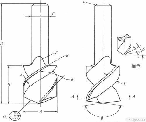 A一鉆刀直徑;B一鉆體長度;c一鉆柄直徑;.D一鉆刀總長度;F一排屑口;G-鉆芯厚度;I1-刃帶寬度;I2-刃帶角;J-棱邊寬度;K-刃帶間隙;L-導角;N-橫刃角;O-刃緣高度;R-內圓角半徑;d一螺旋角;p-頂角;y-第一后角;&-第二后角。