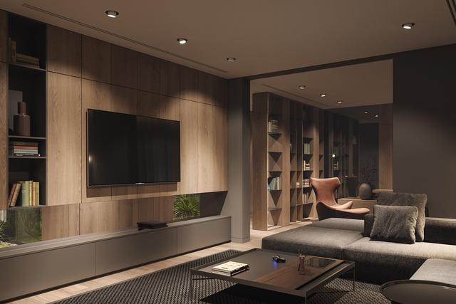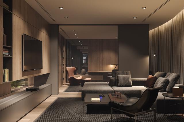 舒適的現代客廳被定向射燈和嵌壁式led燈柔和地照亮,led燈位于毛絨窗簾上方。休息區設置在炭灰色的地毯上,第二個地毯定義了一個家庭辦公空間。