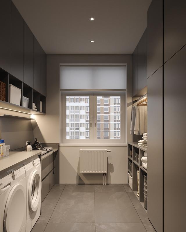 還有一個洗衣房,衣櫥中有燈帶提供照明,一邊是操作臺,另一邊則是儲物柜。