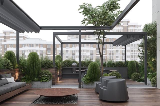 在陽臺上,混凝土和木制的花盆里,植物繁茂。戶外咖啡桌位于內置長椅和戶外椅子之間的卵石核心上。現代的戶外座椅坐落在木制的甲板上,與露臺相匹配的是住宅的室內裝飾。一條小路通向戶外用餐區。
