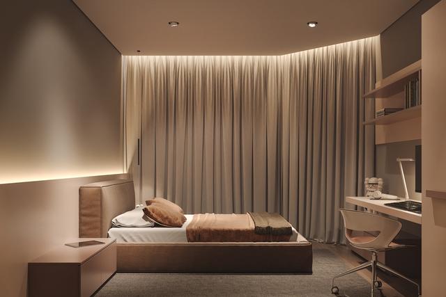 隱藏的LED條和整齊的床頭臺燈給主臥室的照明方案帶來了柔和而朦朧的氛圍。
