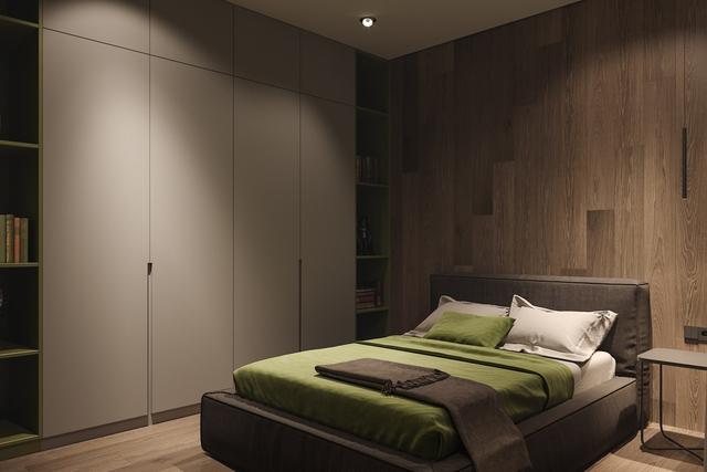 綠色書架與床罩的色調完美匹配。淺灰色的櫥柜平衡了清新的色調,提供了剩余的存儲空間。