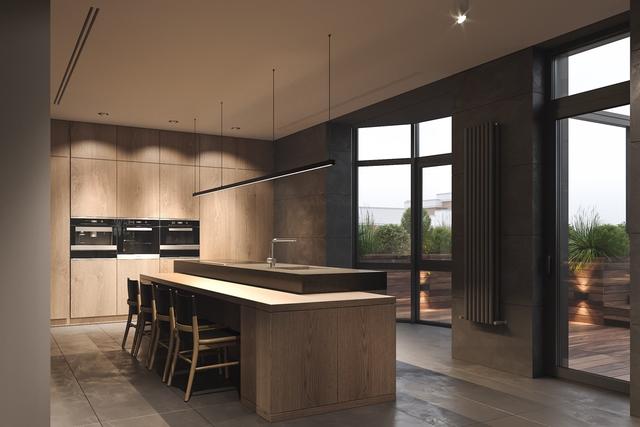 一個線性懸掛燈照亮了廚房的水槽和滾刀區,加上休閑用餐的地方。一排全高的單元和一體化的烤箱填滿了房間的遠墻。