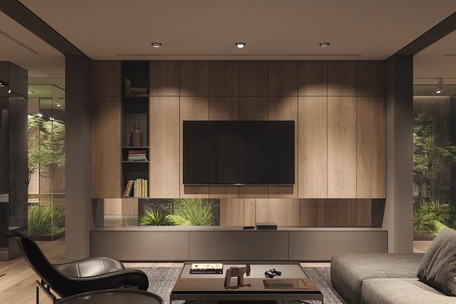 自然材料與玻璃中庭結合在一起,使公寓的內部看起來精致而簡單。