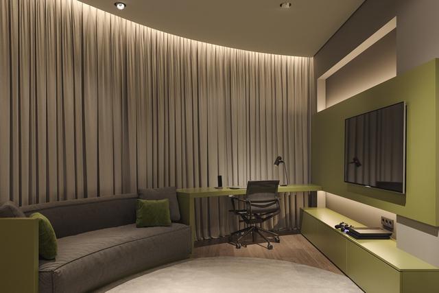 孩子們在房間里的學習區域也被裝飾成綠色,有一個綠色的書桌和毗鄰的電視墻。綠色的散置靠墊也活躍了一個彎曲的灰色沙發。