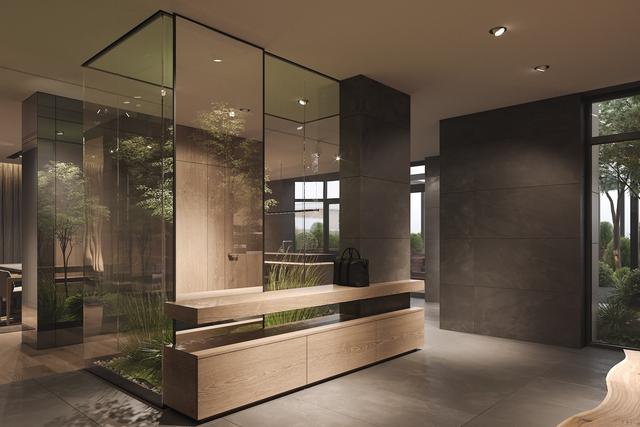 由于在玻璃隔斷中使用了智能玻璃技術,活的綠色植物也可以通過浴室的墻壁看到。其中一個這樣的隔斷在一個獨特的浴室水槽上方支撐著一面發光的梳妝鏡,盡管浴室位于內部位置,但盆的使用者仍能看到美麗的花園景色。