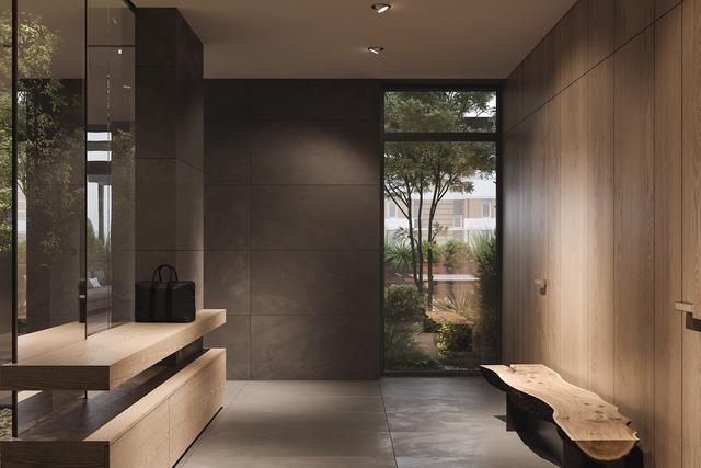 灰色瓷磚和木鑲板相輔相成,形成大膽而穩固的外觀。