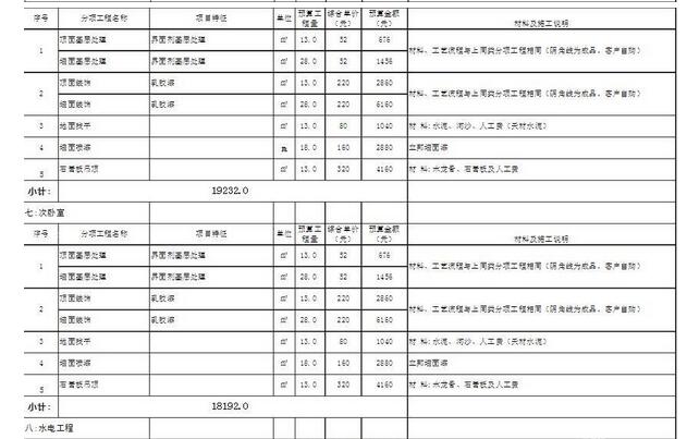 此外,在家庭裝修工程預算表中,我們不能忽視材料及施工說明這個項目,從這一項中能夠清楚的看到施工中所需要使用到的工藝,了解各個施工項目的具體施工工藝是怎樣的,便能夠清楚人工費用收取得是否合理。也能看出裝修公司的工人的施工技藝,了解裝修公司的實力是否良好。