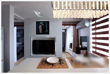 小戶型裝修實例:看到了廚房和臥室的電視背景墻。因為房子的面積比較小,所以就在餐廳和臥室之間把原來的墻挖掉一塊,重新做了可以活動的嵌入式電視背景墻。這樣哪里要看電話,只要旋轉一下就可以了。設計師的想法真的很靈。