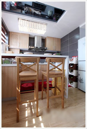小戶型裝修實例:廚房兼并了餐廳了的功能,如果平時就我們2人在家,就兩把餐椅是足夠了。