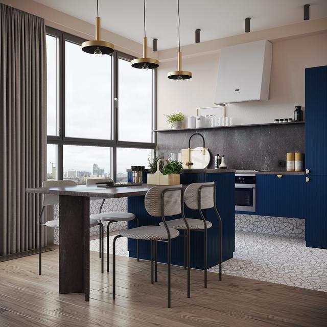 彩色馬賽克效果乙烯基地板包裹在廚房的護壁板上,與堅實的藍色基柜相得益彰。金色的把手和金色的水龍頭給廚房帶來了一種高端的外觀,并散發出與客廳橙色元素類似的視覺溫暖。