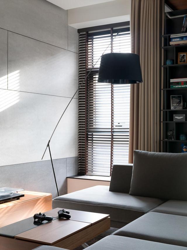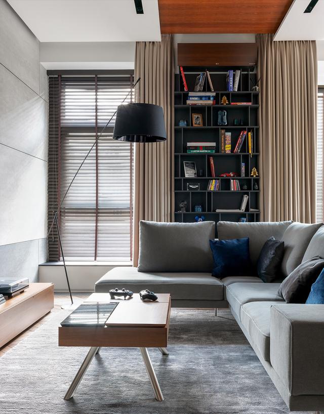 一個內置的書架,在一套薄薄的米色窗簾之間,擺放著許多明亮的書籍和配件。時尚時尚的現代咖啡桌將游戲手柄放在灰色l型沙發的觸手可及的地方。一個大的黑色落地燈提供任務照明。