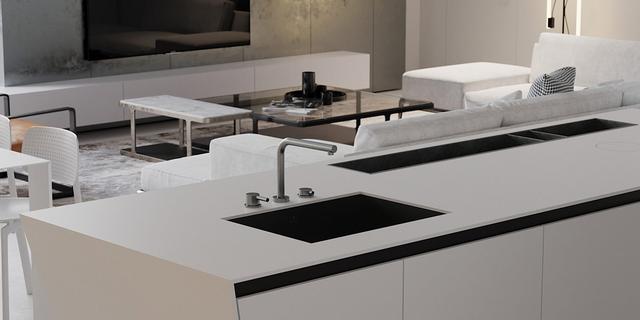 黑色的條形燈光照亮了幾何切割的廚房桌臺。