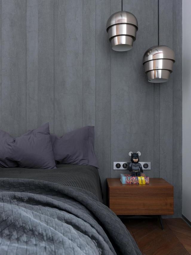 一對鍍鉻的臥室吊燈照亮了床頭柜,在那里可以看到更多超級英雄的裝飾。藍灰色的色調創造了一個更有戲劇性的氛圍。