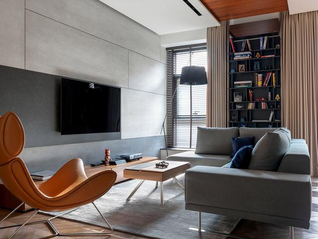 儲物柜的墻面都是橘紅色的門,旁邊的深藍色電視墻則與之相映顯得更有質感。