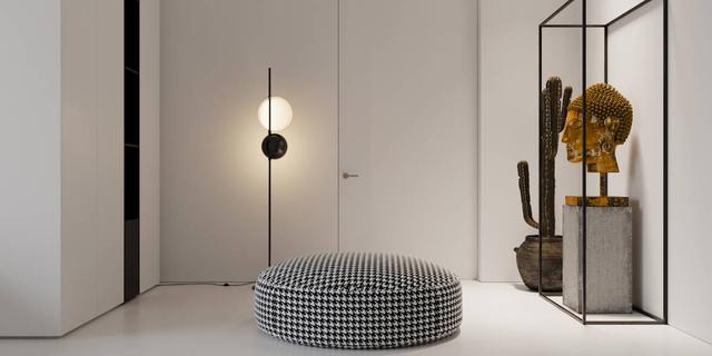 青銅佛像的框架是黑色金屬制品。單色千鳥格坐墊使整個空間顯得不那么單調。