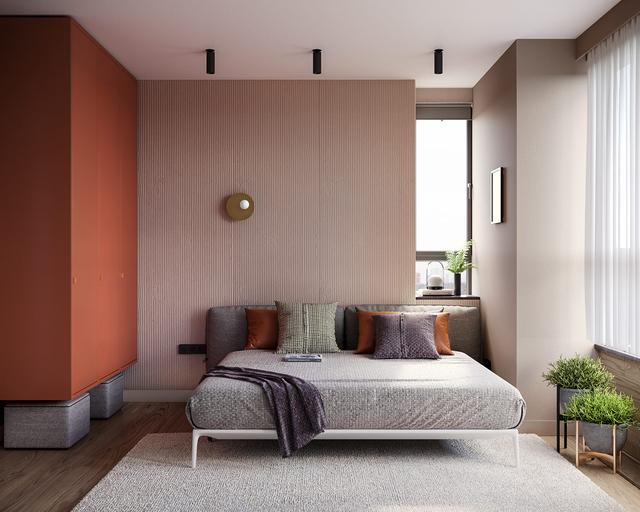 第二間臥室的配色方案換成了熱橙色。床上墻紙和橙色儲物柜在這個空間創造了特色墻。橙色的枕套將灰色的床與周圍的色調聯系在一起。紫色的靠墊和靠墊提供了色彩對比,一對獨特的植物支架增添了著綠色的活力。