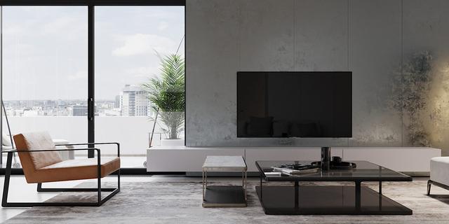 咖啡桌和配套的媒體單元在木紋中帶有橙色調。電視墻裝飾形成了一個酷的單色背景。