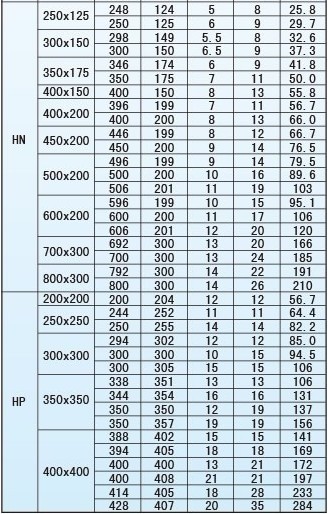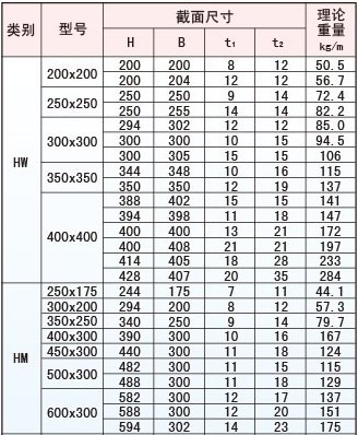 為了方便大家對(duì)H型鋼理論重量和規(guī)格有個(gè)清晰的認(rèn)識(shí),這里我們以表格的形式為大家展出。H:高度、B:寬度、t1:腹板厚度,t2:翼緣厚度。