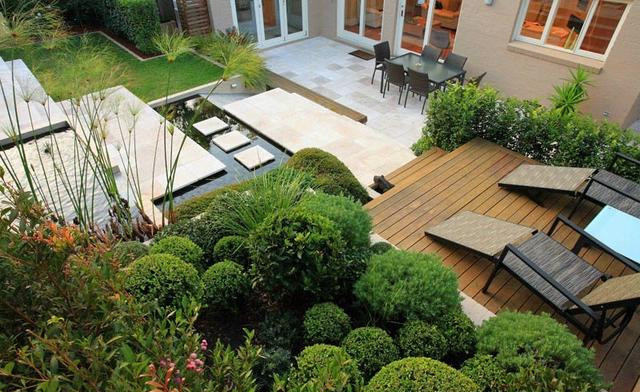 后院的布局不必是標準的和無聊的。看看這個驚人的設計,使用曲線和不同的材料,以分區出座位區和綠化。