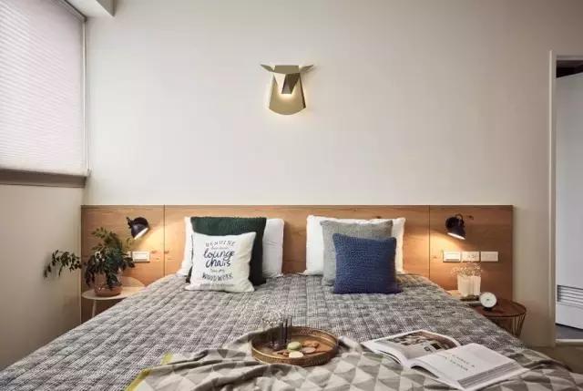 床頭背景墻設計了半高的原木,帶入田園寧靜的氣息。