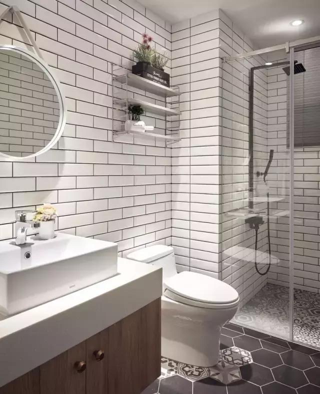 白色墻磚的浴室墻,看起來非常潔凈明亮。圓形的鏡子,是這間衛浴間里獨特的風景。