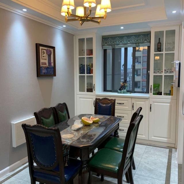 這是餐廳的效果,餐廳的窗戶旁邊,設(shè)計了一個整體式的酒柜,充分的利用了這面墻的位置,窗臺延伸出來的的位置正好可以當做一個餐邊柜來使用。非常的不錯。