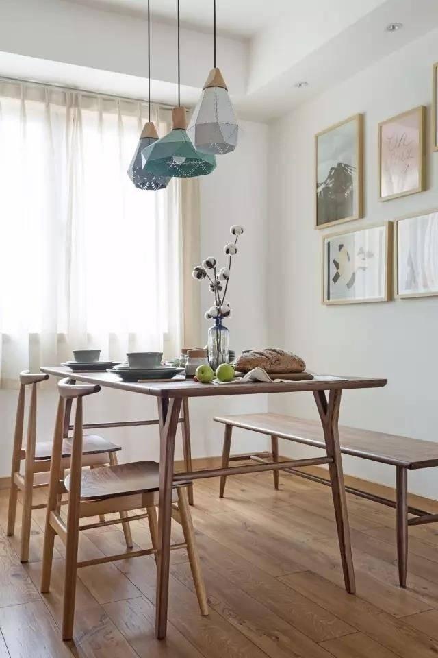 原木色的餐桌椅,樣式充滿了流行的元素,但是這種流行的元素一點都不夸張,反而覺得有種可愛風(fēng)格的美,這種美感讓人坐在椅子上就不想起來的沖動。還有三盞北歐風(fēng)格的小吊頂,造型個性,充滿現(xiàn)代流行的元素。