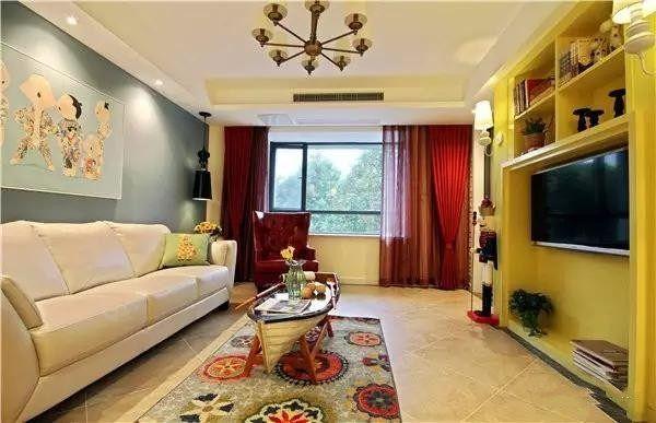 一張一字型的皮質白色沙發,背景墻采用淺藍色,掛上一副大寫的裝飾畫,很是和諧。電視背景墻采用明黃色搭配上大紅色單一和大紅窗簾,整個客廳多彩多樣,加上花色地毯,個性的茶幾,和一些大大小小的裝飾品,時尚味十足!