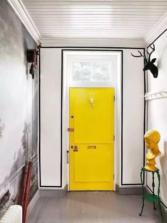 作為空間之中的穿梭之域,門的設(shè)置會影響整體的視覺感,黃色的門與簡單的白墻相結(jié)合,讓整個(gè)空間更具色彩美。