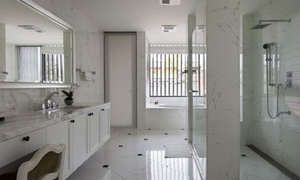 運用石材立柱,兼具穿透及層次感。而加長的洗手臺面,也規劃出讓女主人坐在小椅子,輕松地吹頭發或卸妝的空間。