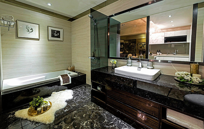 另外,在浴缸的邊上做一個小小的酒吧,人泡在浴缸里,一伸手就有美酒,是不是特愜意?家里的酒吧就應該是給自己用的,是家中的休閑空間,它不應該張揚地安在客廳里。在浴缸里洗泡泡浴,這是人最為放松的時候,自然也是酒吧最合適的處所。