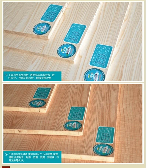 2、千年舟細木工板采用南方杉木、楊木、桐木等制作,面底板采用奧古曼貼面,采用兩次砂光,兩次成型的先進生產工藝,產品具有平整度好、色差小、輕質、不易變形等特點,可廣泛應用于室內裝修和家具制作。先進的生產工藝和過硬的產品質量,使產品暢銷全國并深受用戶青睞。
