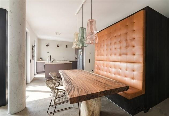 上面的餐廳有一個(gè)高的皮革長(zhǎng)椅和一個(gè)鄉(xiāng)村餐桌,設(shè)計(jì)有城市的風(fēng)格,但在荒野的心臟。三種顏色的玻璃掛件完成了這個(gè)美麗的角落設(shè)計(jì),這是一部分由卡哈德建筑風(fēng)格別致的內(nèi)飾。