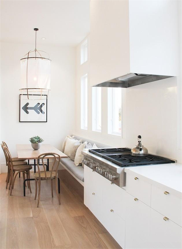 位于洛杉磯的一家生活方式設(shè)計(jì)公司30 Collins設(shè)計(jì)了一個(gè)位于白色廚房(上圖)的清新、干凈的現(xiàn)代餐廳。這個(gè)定制的單板凳角安裝在端部櫥柜和墻壁之間。