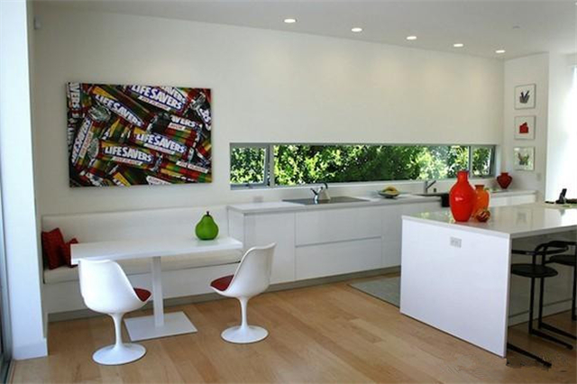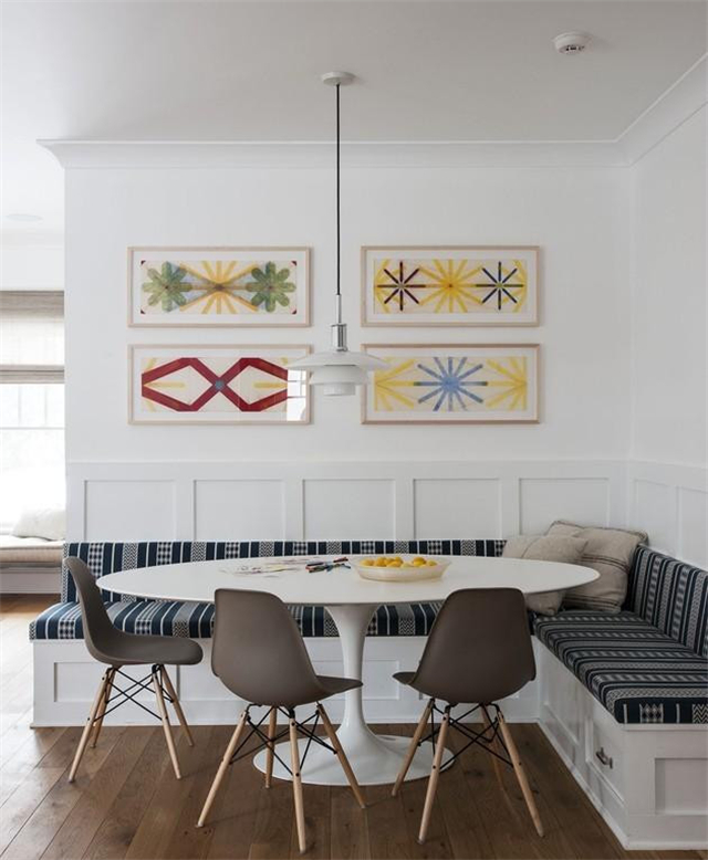 對(duì)于一個(gè)豪華的Nook設(shè)計(jì),您可以使用這個(gè)宴會(huì)早餐Nook創(chuàng)意(上圖),在一個(gè)世紀(jì)中期的家中發(fā)現(xiàn)。如果你的廚房有足夠的空間,你可以把另外兩張椅子拉起來(lái),讓這個(gè)角落為四個(gè)人設(shè)計(jì)一個(gè)宴會(huì)。請(qǐng)注意,內(nèi)置自助餐是如何將廚房空間分隔開來(lái),從而創(chuàng)造出一個(gè)優(yōu)雅的用餐區(qū)的,當(dāng)然,大窗口會(huì)讓您的早餐更加美味。