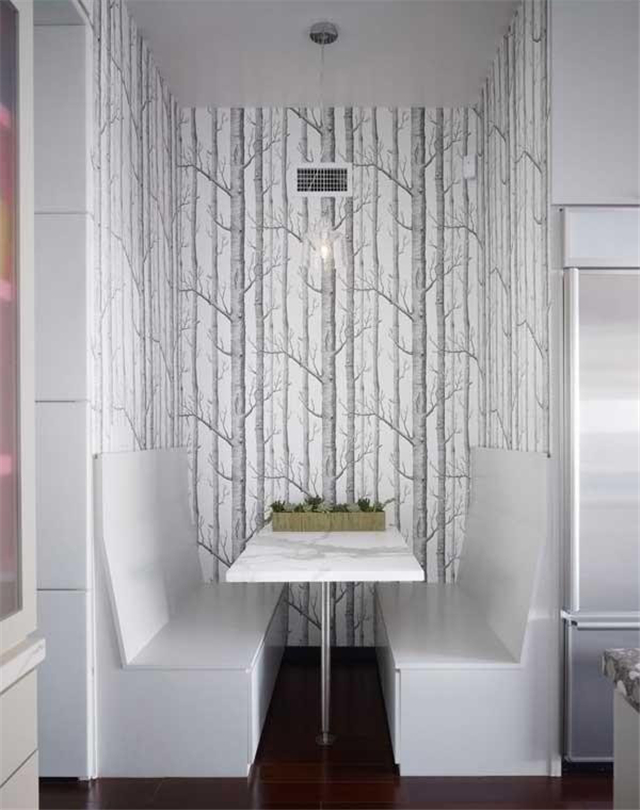 這個(gè)令人嘆為觀止的內(nèi)置早餐角落位于洛杉磯一個(gè)當(dāng)代折衷的家中,由沃倫·泰肯建筑(Warren Techentin Architecture,WTARCH)改造。裝飾性壁紙的靈感來(lái)自外面的樹木。內(nèi)置的長(zhǎng)椅由白色三聚氰胺板制成,桌面是一個(gè)金屬管腿上的小大理石板,一端也支撐在墻上。這種設(shè)計(jì)也是DIY的一個(gè)很好的候選者。