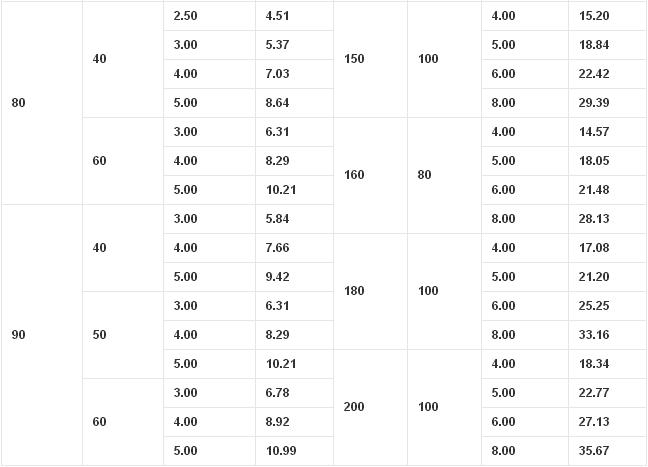 2[(a-d-2r+π(r+d/2)/2+(b-d-2r+π(r+d/2)/2]x7.85d(kg)a,b為矩形管長和寬(m),r為管內(nèi)腔四角的圓弧半徑(m),d為壁厚(mm)