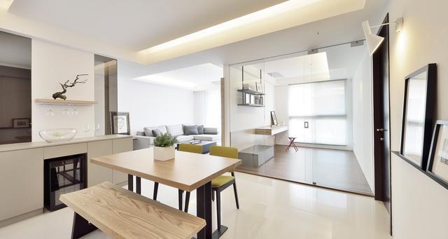 是用透明的玻璃門隔斷出來的空間,進門看到這個區域就會顯得室內非常通透。同時還能作為休閑區使用,為家里提供了一個獨立私密的空間。