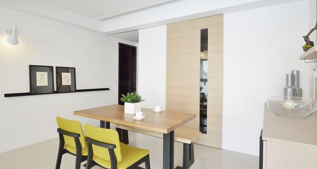 再過餐廳區域,簡單的原木色餐桌椅,高級灰和原木也是很好的搭配。