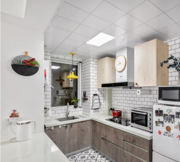 開放式廚房,白色墻壁和地磚,廚房看起來非常明亮干凈,廚房外也有一個(gè)一體式的吧臺(tái)。