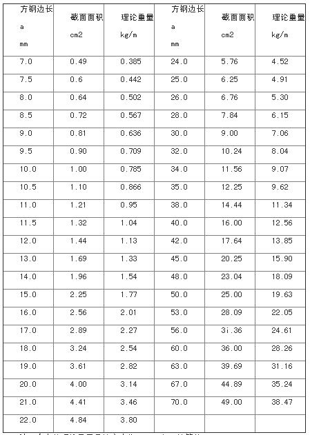 1.2冷拉方鋼的邊長、截面面積及理論重量列于表1。