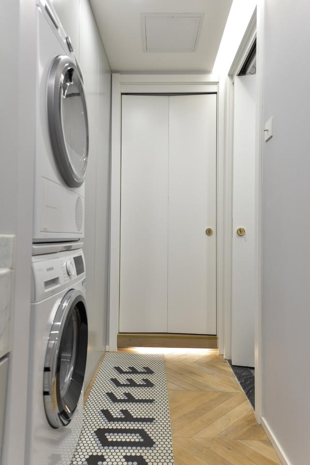 走廊除了做柜體,還能安放洗衣機(jī)、烘干機(jī),三者結(jié)合,讓洗、烘、收一氣呵成,樂(lè)趣十足。