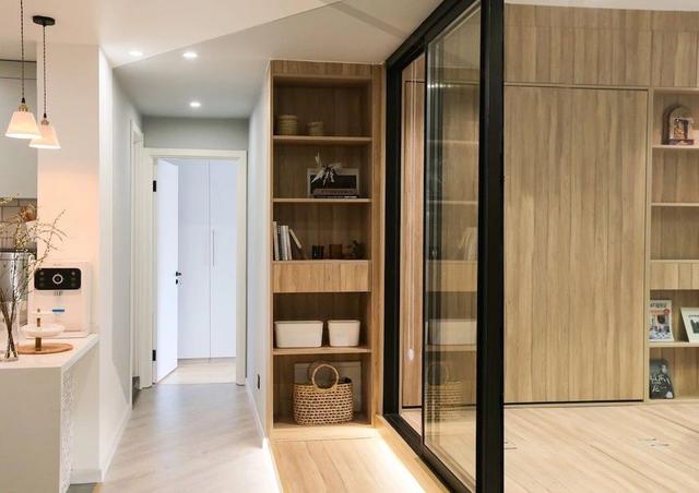 拆了右側(cè)墻壁,換成玻璃門(mén)且往里移,留出一個(gè)開(kāi)架儲(chǔ)物空間,走廊寬度變大,長(zhǎng)度變短。