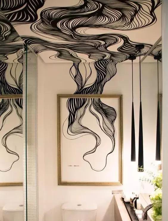 線條紋樣充滿張力,直接沖出畫框邊界,從墻面延伸至天花板,視線引導垂直空間融合向水平空間。
