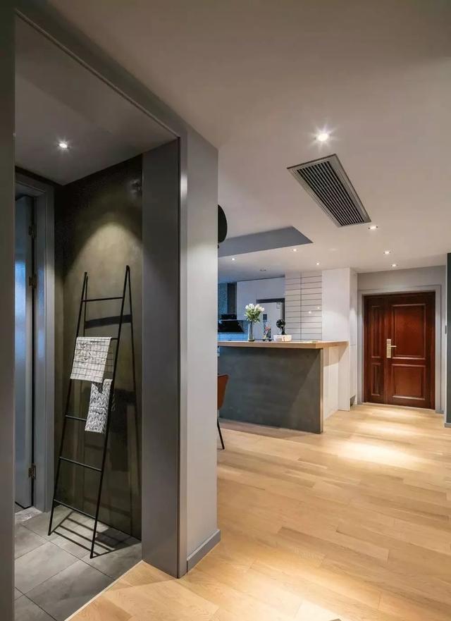 室內墻面多采用深灰色,顯得非常的高級,再配上淺木色的地板,又讓整個空間彰顯出大方的一面,高開門框設計,是讓整個空間更加大氣開闊的常見手法。