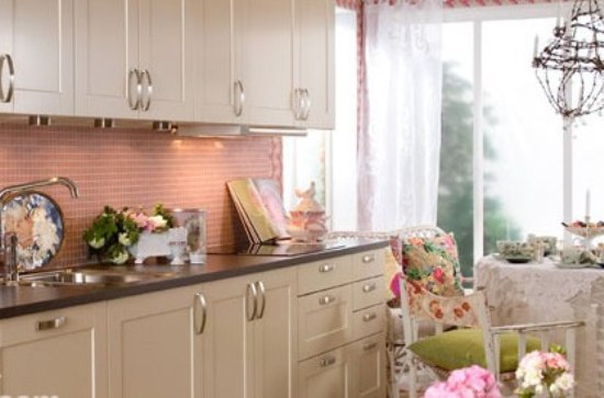 用橘粉色瓷磚帶來滿滿女人味,餐桌和餐椅處的花朵圖案、蕾絲花邊等也增色不少。