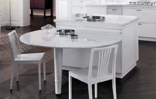 櫥柜的儲(chǔ)物單元如果單獨(dú)設(shè)立會(huì)顯得很突兀,在垂直的位置安裝餐桌面,L形格局可以更好地與起居空間分隔開來。這類餐桌一般需要定制,桌面尺寸和支撐腿之間的承重比例需要計(jì)算精確。