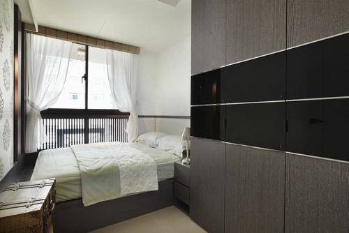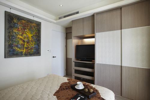 裝修TIPS:主臥里床尾為一字型衣柜收納。